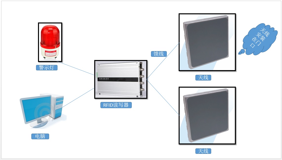 RFID商店智能报警系统中天线安装尤为重要,首先应根据店铺的实际大小及需监控的范围来对天线个数及尺寸进行选型。在店铺的监控区中可安装2 个RFID天线,该两个天线识别范围可允许重叠,从而保证监控区被覆盖。在柜台安装一个桌面发卡器,通过该天线对已销售货品上的标签注销。