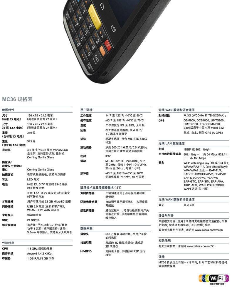 MC36由于出厂标配不含原装电源(充电器)跟数据线,跟普通安卓手机数据线电源通用!