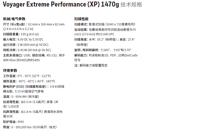 霍尼韦尔1470G二维码扫描枪具有与前代产品一样有竞争力的价格,且比之前的型号或同类竞争产品提供更好的耐用性和更强大的扫描功能。霍尼韦尔honeywell. 1470G对于采用 1D 和 2D 条码读取并且需要更强大和可靠解决方案的店内零售工作流程,它们是理想的手持式扫描仪选项。我们设计了 Voyager XP 1470 系列扫描仪,帮助确保为您的零售员工和客户提供更好的体验。其增强的低质量和破损条码读取能力可为每个人避免令人沮丧的结账体验。扩展的扫描距离直达客户购物车的底部,而长距离的蓝牙范围使速通或旺季卫星 POS 站具有更高的操作灵活性。霍尼韦尔Voyager XP 1470 系列扫描仪可应对繁忙销售点扫描的苛刻要求——经设计可承受从 1.8 米(6 英尺)高处的 30 次跌落和 0.5 米(1.6 英尺)范围的 1,000 次滚动——同时提供比同类解决方案更高的精度。我们在标志性的 Voyager 系列手持式扫描仪平台上构建 霍尼韦尔1470二维码扫描枪,因此它们与您已有的 Voyager 附件完全向后兼容,降低了总拥有成本。