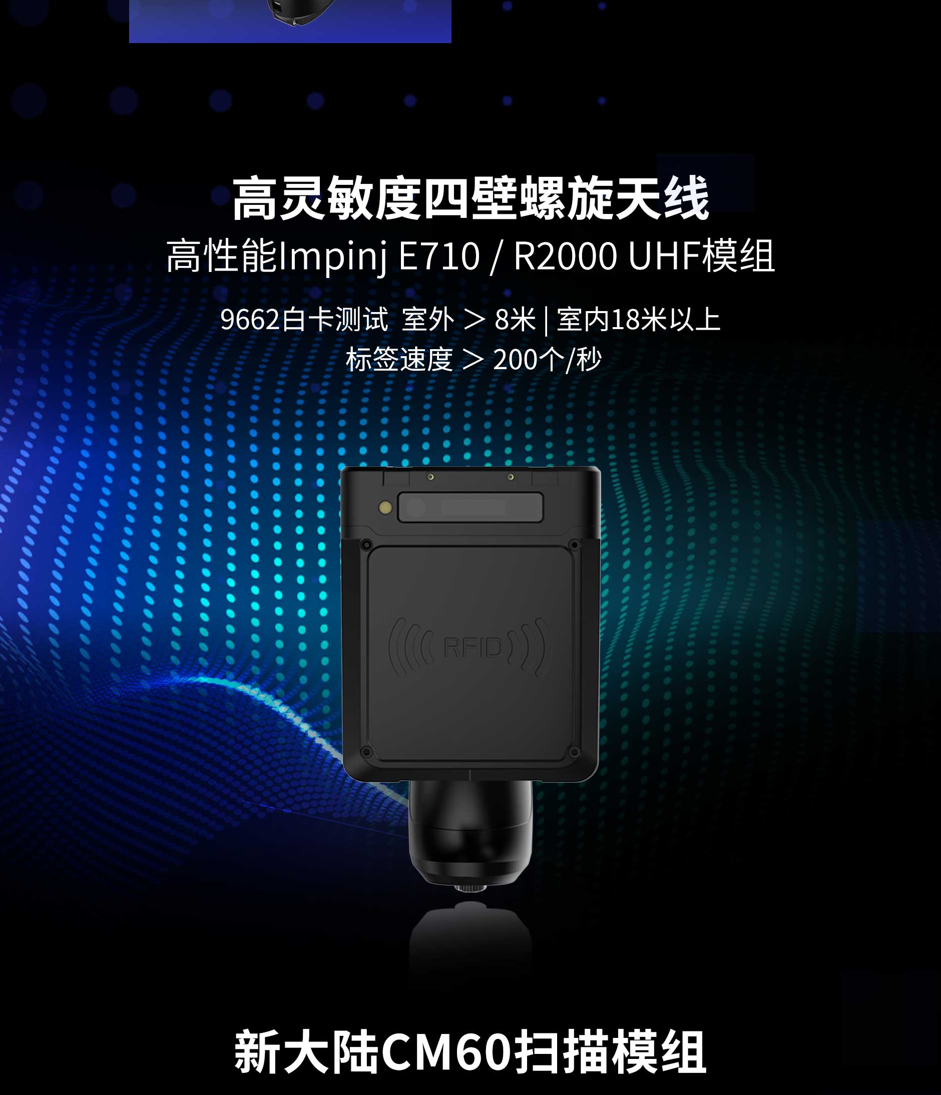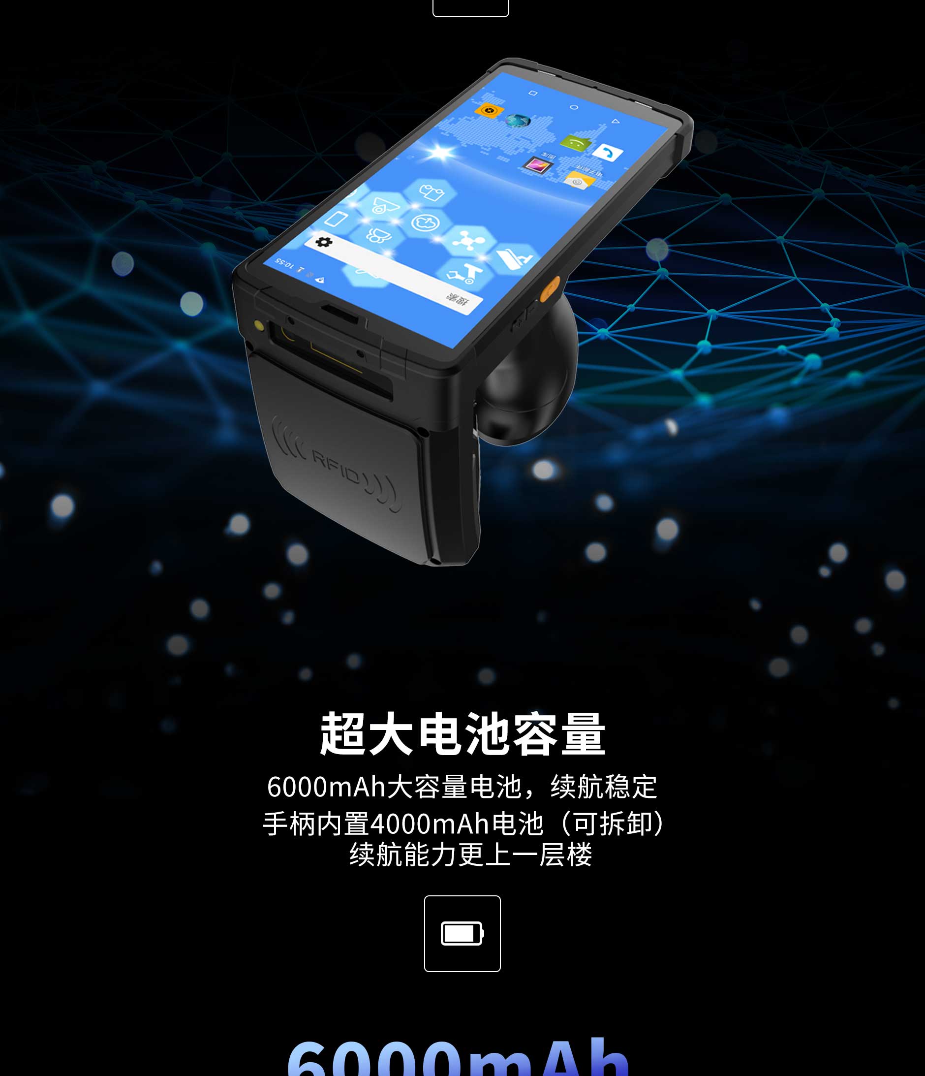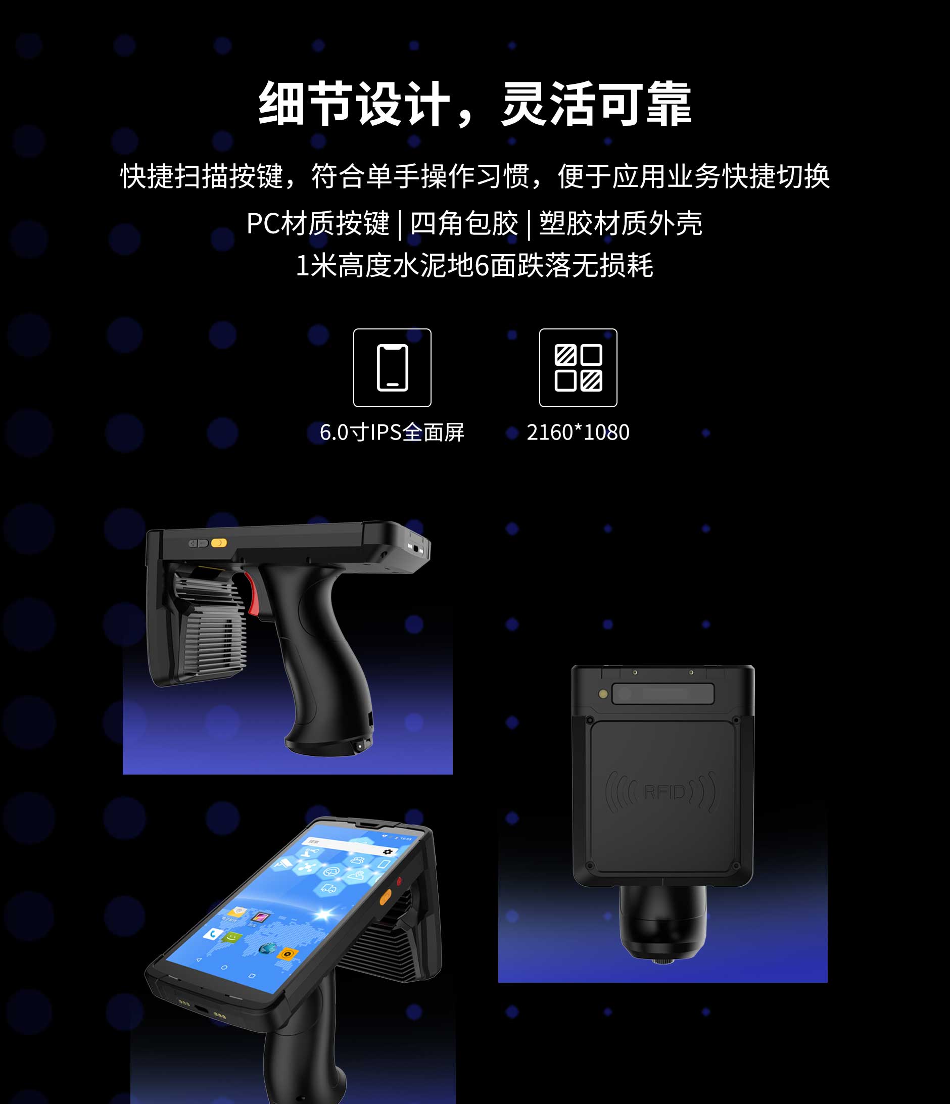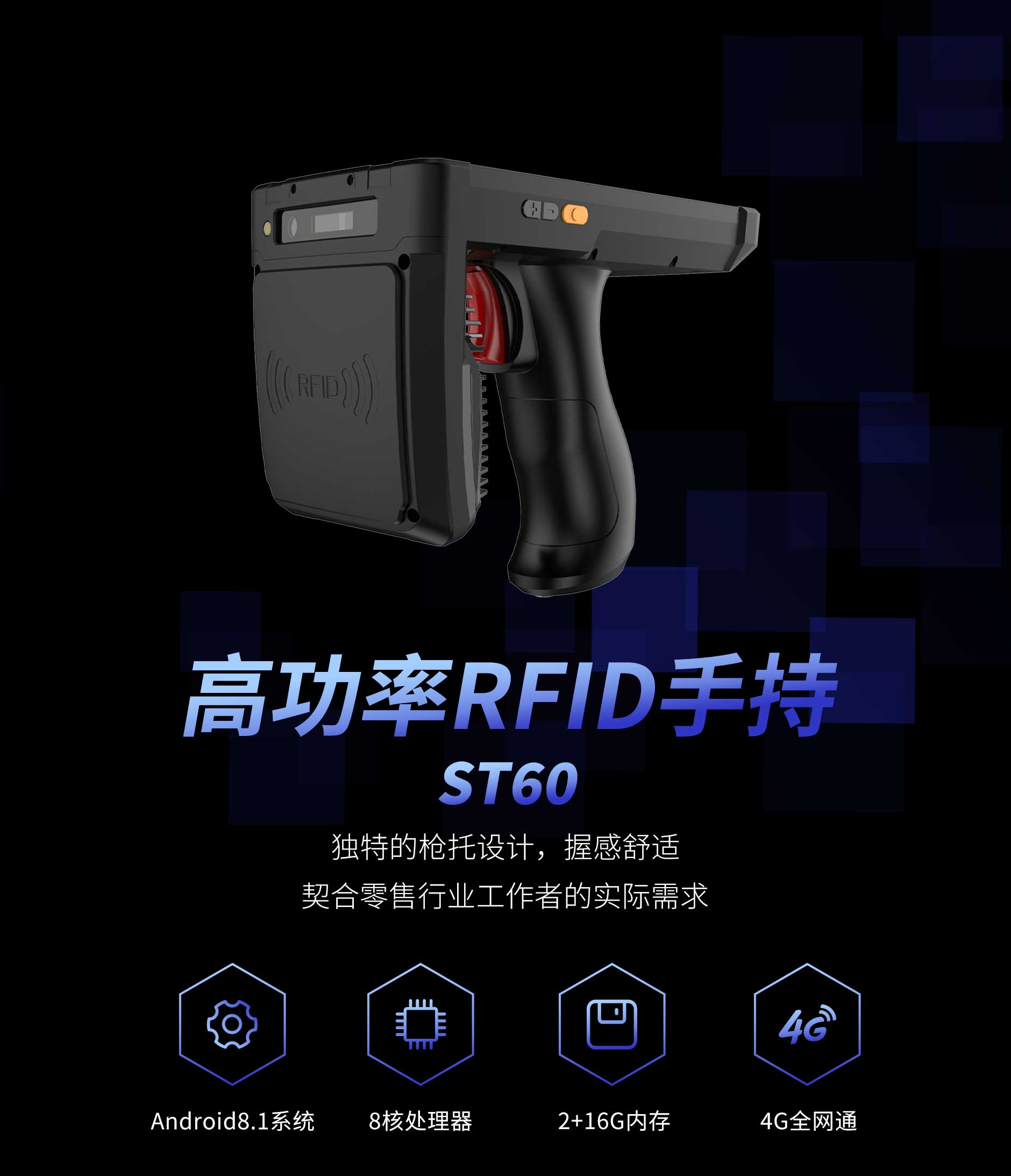 思必拓ST60超高频RFID手持终端pdaST60 基本参数处理器8核 2.0GHz操作系统Android 8.1存储RAM 2GB ROM 16GB屏幕尺寸6.0寸,IPS高亮屏机器尺寸160*80*15.8mm(枪柄长110mm)重量600g摄像头后置1300万自动对焦摄像头,高亮度LED闪光灯,前置500万定焦摄像头音频前置双立体声扬声器,音量90db±3db(测试距离10cm)传感器地磁,加
